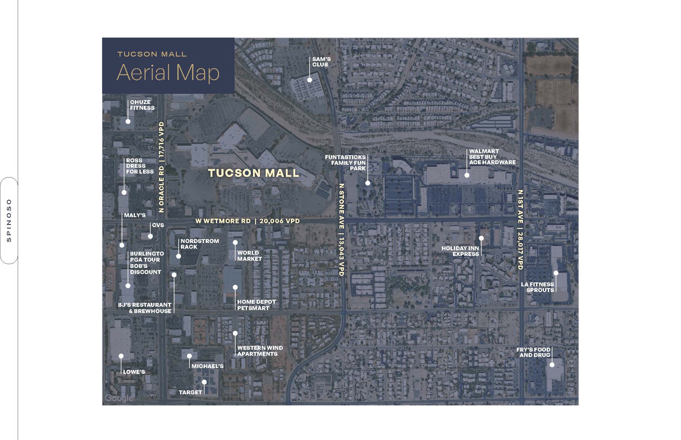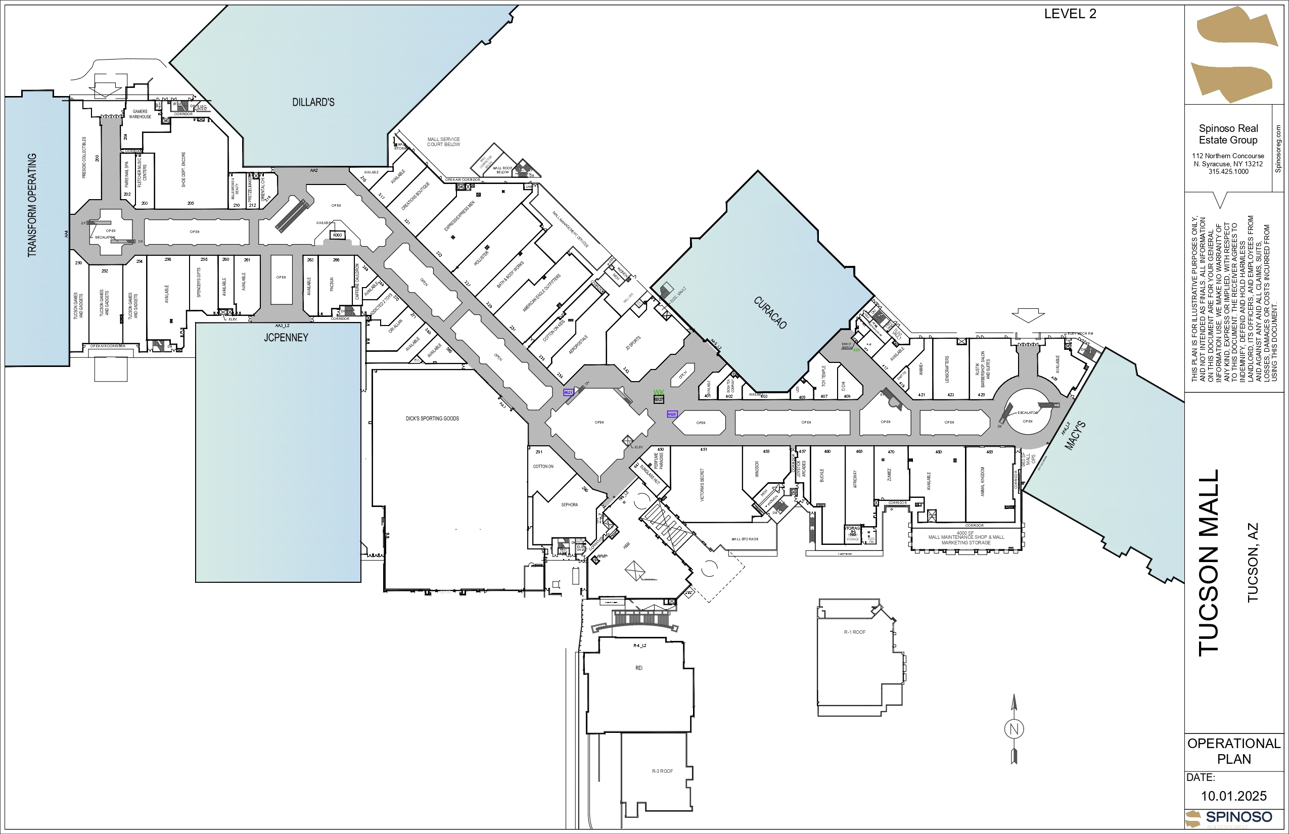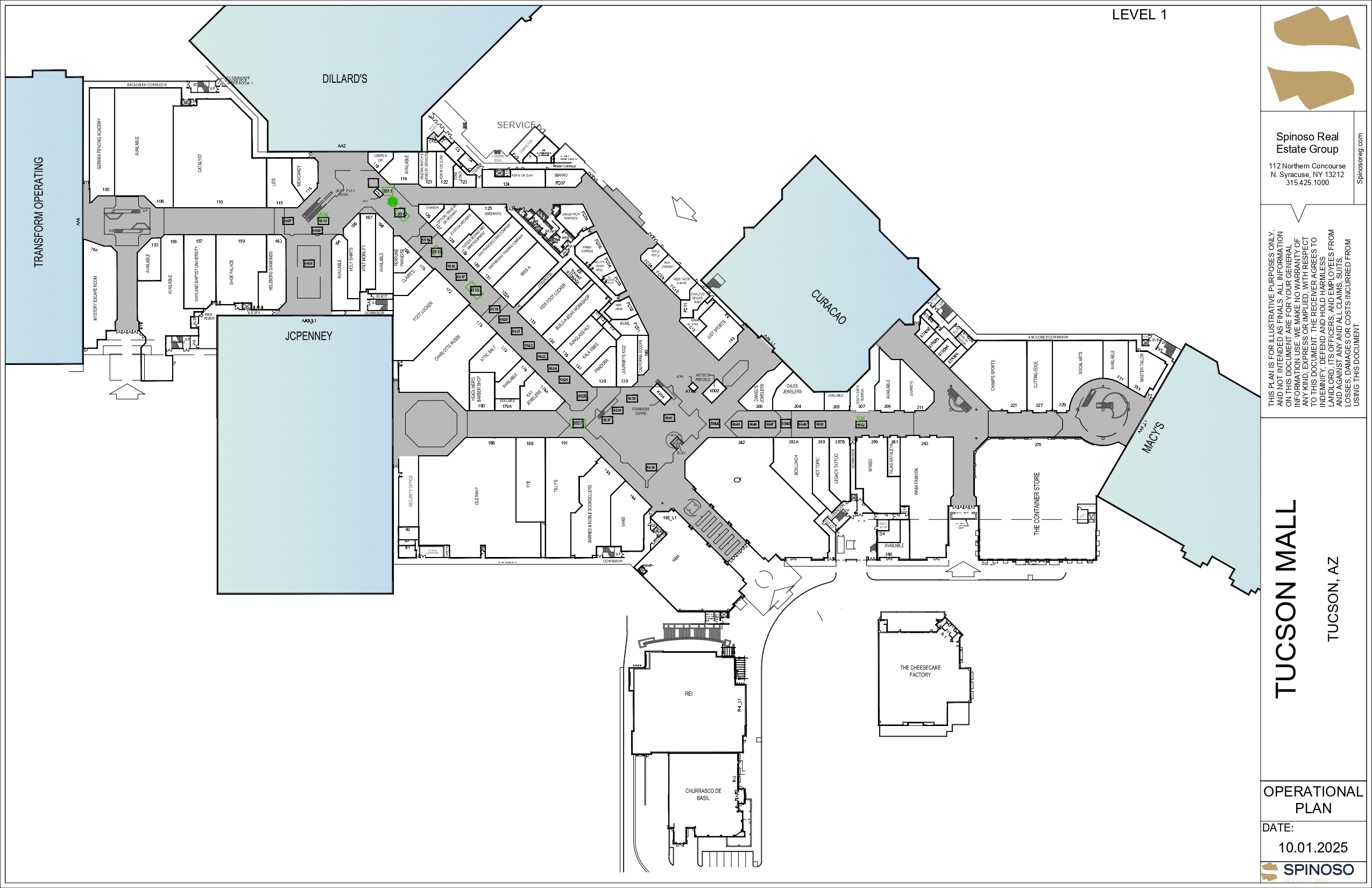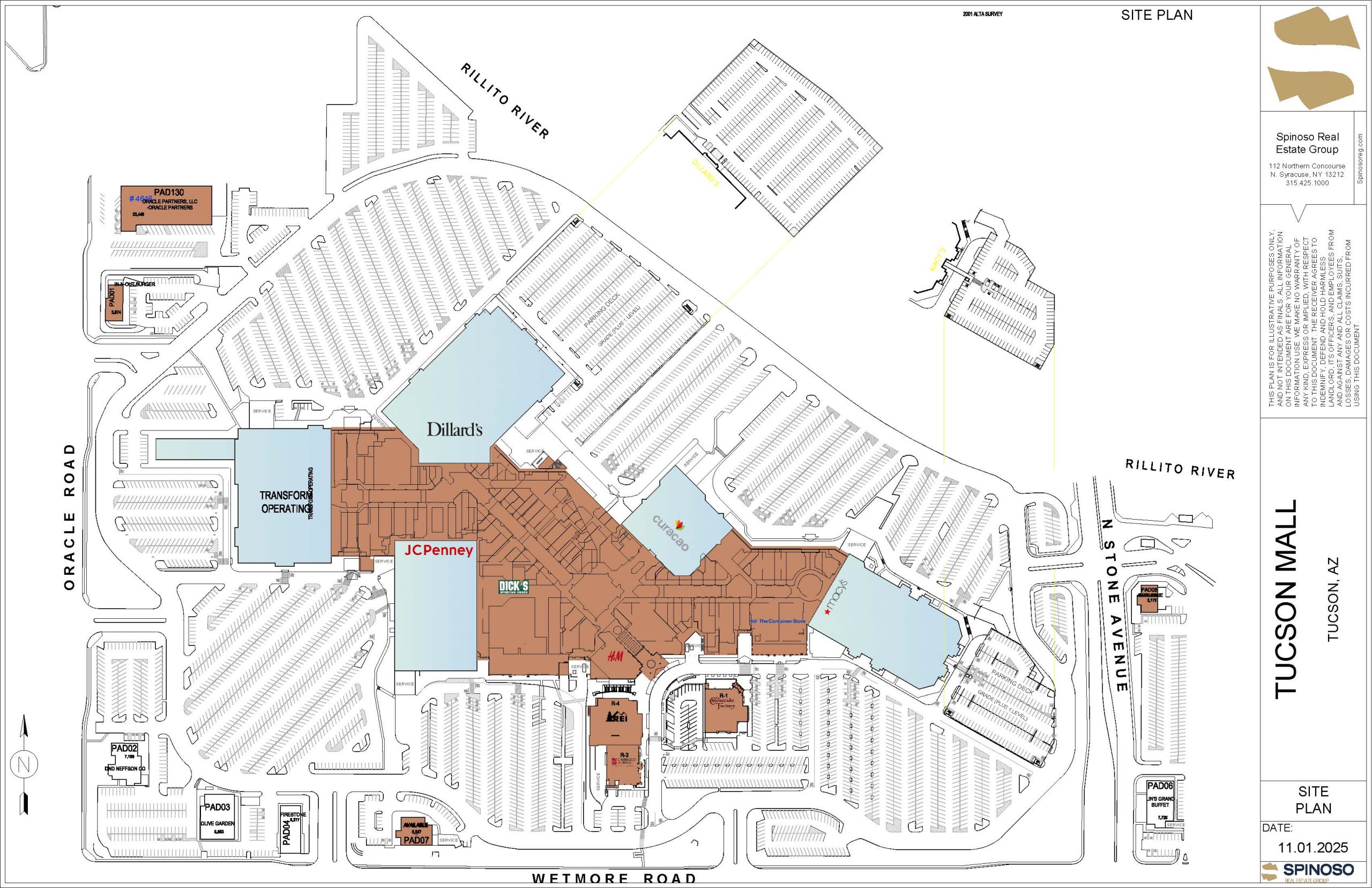 At 1.3 million square feet across ±91.5 acres, Tucson Mall is the largest shopping destination in Southern Arizona. Anchored by Dillard’s, Macy’s, JCPenney, Curacao, Dick’s Sporting Goods, and REI, the center features more than 170 stores and restaurants, including The Cheesecake Factory, In-N-Out Burger, and Churrasco de Brasil. Strategically located along the bustling Oracle Road retail corridor, the mall connects affluent northern suburbs with the University of Arizona, serving as the region’s cornerstone of retail.